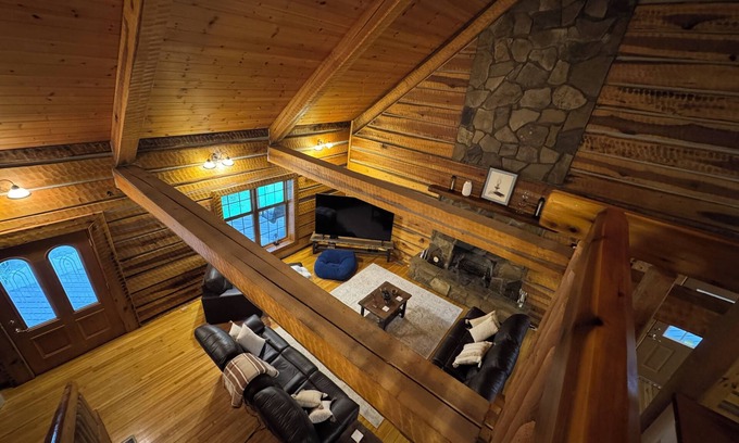 The living has two reclining couches, a chair with ottoman and an 84 inch tv for your favorite shows. Open loft provides for an airy feeling and a two-story stone wood burning fireplace. Music lovers can ask Alexa to play their favorite music.
