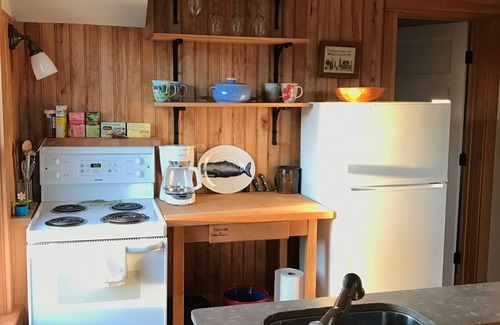 From the little covered patio, the Fish House opens to an inviting entryway, which leads to a flight of stairs and the main living space. Designed for two adults to spend weeks at a time, you will be greeted by a wall of windows overlooking much of the property, Horn Barn Cove and Muscongus Bay just beyond. There is a separate, cozy bedroom with large closets and storage, a full bathroom with gleaming white tub and luxury bed and bath linens. With comfortable, high-end furniture our guests can sit and relax, prepare a meal in the well-equipped kitchen and dine indoors - or outside at the picnic table. Our shorefront is a short walk through our yard and down a little path to the granite-lined coast where you can wade and look for treasures or just sit, relax and listen to the water lap against the rocks. For swimming and kayaking, our association dock with kayak ramp is just at the end of the street. There are miles of safe roads on which to bike, both in our immediate area and throughout the mid coast. For a real treat, upon return from your adventures you can make use of our heated, outdoor shower!