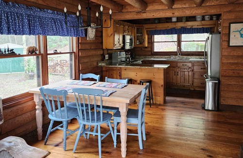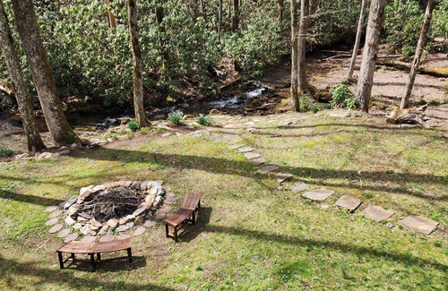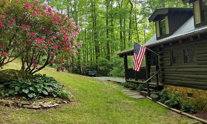 Leave your cares behind and discover this charming and comfortable 2-bedroom gem located on lovely Junaluska Creek near beautiful Nantahala Lake. Sit back and breathe the clean mountain air at 3200' elevation surrounded by forest and wild rhodendron. Walk the stepping stone path to dip your feet in the cool, rushing water of the creek. This rustic log cabin has all the modern comforts and features a master bedroom with king bed and private full bath. Kids will love the open loft containing 1 queen bed, 1 full bed, and 1 twin bed with its own full bath. Both bathrooms are equipped with a tub/shower combo, hair dryer, and toiletries. The full kitchen has updated granite counters and contains everything you need to stay in for home-cooked meals. Enjoy the convenience of amenities like WiFi, central heat and air, dishwasher, 3 big screen tvs and a washer and dryer. Relax in rockers on the front porch or grill out on the deck overlooking the creek. Let your stress melt away in the brand new hot tub (added August 2025). Children will enjoy roasting marshmallows at the fire pit or playing ping pong or corn hole in the back yard. With over 2 acres and 300 feet of creek frontage, there is plenty of room to explore and search for the numerous varieties of woodland wild flowers and plants. On cool mountain nights you'll enjoy the warmth of a fire in the wood stove. If the weather doesn't cooperate, you can stay inside and curl up with a book in front of the huge windows overlooking the yard and creek or have family bonding with the card and board games we offer.