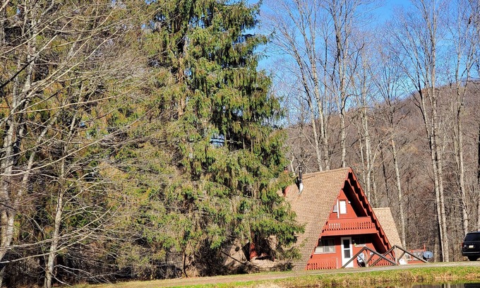 "This property is exactly as advertised. It is a A frame in the woods with no bells and whistles. If you want to get away from your busy life this is the place to go. There is a small pond directly in front of the house with many frogs and salamanders, didn't seem to be any fish. The fire pit is right next to the pond and has a grill that we used to cook over a wood fire. It was nice to get away from phone calls and emails for a weekend."