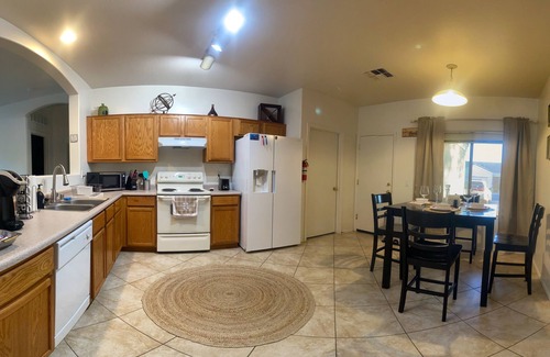 Upon walking in you will find the kitchen and dining area to your right and the two smaller bedrooms as well as a bathroom to the left. Master bedroom is diagonally opposite side of the two smaller bedrooms, this is a split floor plan home. Each room has a queen size bed. Master bedroom has a private bathroom as well as a large NON JACUZZI TUB, but great for unwinding and relaxing. The walk-in closet is NOT ACCESSIBLE and being utilized as storage for house needs. From the front door straight ahead and slightly to the right is the living room. Straight ahead and to the left is the backdoor to a small fenced in patio with a propane BBQ grill and seating for four. Beyond the fence is a pool, the pool is NOT HEATED but hopefully it will be in the future. In the backyard to the East is a pool shed with pool pump equipment. Due to energy cost the pool pump works during the night to avoid a surcharge on electricity bill. Pool is maintained on the weekends so there maybe a pool cleaner stopping by but usually the process is quick, special arrangements can be made. There are four TVs in the house all have ability to be signed into NETFLIX, Hulu, Prime, YouTube etc and all have local channels as well as a live security camera feed to dedicated HDMI channel. Laundry on site that you are welcome to use but may need to provide your own laundry detergent. We are continuously evolving our hosting experience and really appreciate the feedback from our guests. If you have any questions please feel free to ask.