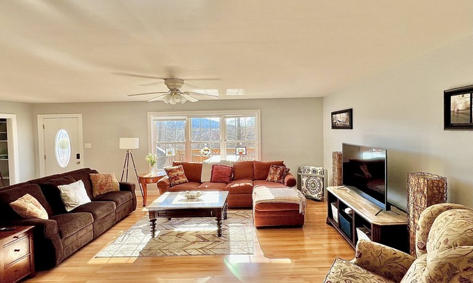 This charming 3-bedroom, 2-bath residence boasts mountain views and wildlife, making it an ideal city retreat. Nestled on a 47-acre working farm, it is equipped with all the necessary amenities. Unwind with family and friends at the seasonally heated pool, available from May 15th to September 30th. Savor snacks around the backyard fire pit or pay a visit to our farmer friend, Mr. Brian, and his cows. Discover tranquility and peace in this welcoming home.