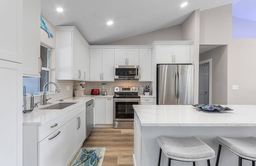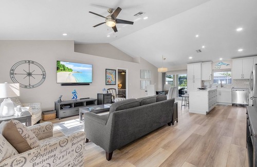 Escape now to this wonderful pool home on freshwater canal with open concept Kitchen, Dining Room and Family Room. Renovated throughout with a contemporary flair. 2025 New Hurricane Windows!!!! New Contemporary Front Door. 2024 master bathroom remodel with new shower and flooring, 2023 Kitchen remodel with new Cabinets, Large Island with lots of storage, New Cambria Countertops, beautiful Back splash, new luxury vinyl plank flooring, and new lighting. The house has three bedrooms, two bathrooms, Great Room, Open Concept Kitchen with stainless steel appliances, and washer and dryer. Heated pool in large Lanai, outdoor dining area, gas fire pit with seating area, cement dock with lounge chairs. Very quiet neighborhood but close to shopping, grocery stores, coffee shops, restaurants, and near Matlacha fishing village where you can watch the Dolphins and Manatee swimming and playing in the gulf.. The house is fully furnished and has a large gas Weber Grill, beach lounge chairs, and coolers. It is a short drive to Punta Gorda, Fort Myers Beach, Sanibel, and Naples.