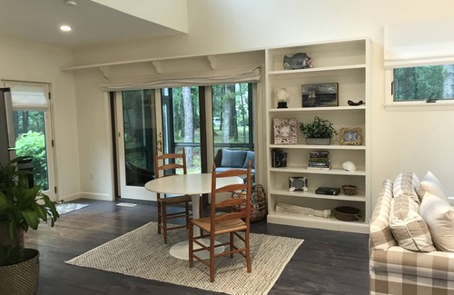 A spacious, one room studio, steps away from Oregon Beach. Located at the end of Main Street, with access to all that Cotuit has to offer; the cottage is nestled in a quiet, wooded property. The room is clean and bright, with all of the amenities that will make you feel relaxed and content after a day of exploring the Cape. It is equipped with a brand new kitchenette and washer/dryer. It has a queen bed and a comfortable pullout sofa.