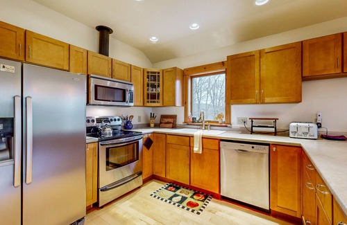 Inside the home, you'll find a cozy and well-equipped space with amenities such as a gas fireplace, washer/dryer, internet access, and a fully stocked kitchen with modern appliances. The comfortable living room is perfect for relaxing after a day of outdoor adventures, and the sofa bed provides additional sleeping space for extra guests. The garage space can be used for games and storage of skis, bikes, and other items, as this space is not available for parking vehicles.