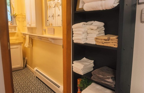 Upstairs, on the 2nd floor is a sizable lakeside bedroom, with a king bed, sitting area and exterior balcony overlooking the lawn and provides gorgeous views of the lake. A second spacious bedroom, with a king bed and a twin bed, overlooking the dooryard and has a view of the interior woods. In between these two bedrooms is a half-bath for convenience.
