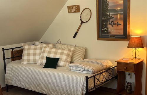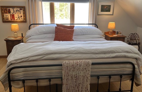 The cottage is accessible with a keyless entry from the wrap-around deck, opening into the kitchen area, which is spacious and well equipped with plenty of storage and counter space. There is an area for you to hang your outdoor gear, place your shoes, recharge your electronics, etc. and where you will find useful information on the cottage, and what to see and do in the area (day trips, breweries, restaurants). The first floor has an open layout joining the living room, dining area and kitchen as one. The lake can be seen from these spaces through large windows and a sliding door leading to the deck. Furnishings were chosen for your comfort and include a flat-screen tv, selection of games and a large table to gather around to share your meals or just to sit and unwind after a day spent exploring. Also on the first floor is a bedroom with (1) queen and a cozy, full bathroom with bath / shower.