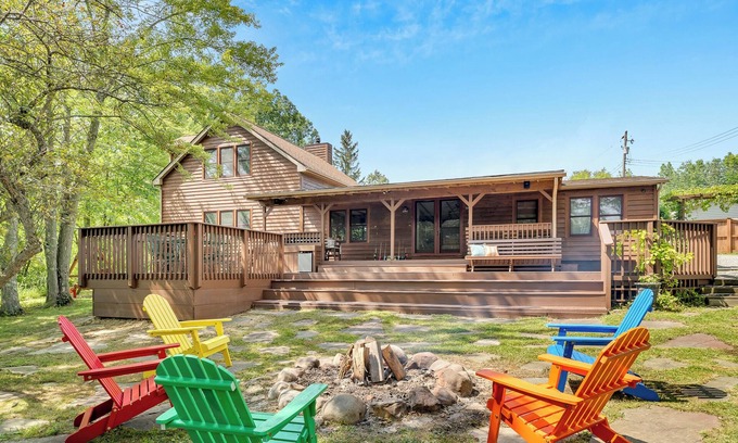 Welcome to Inspiration Point! Nestled at the end of a private drive and surrounded by 180 degree lake views in one of the most peaceful year round areas of Berlin Lake. This beautiful one-of-a-kind lakefront cabin offers serenity, relaxation, and adventure for couples, families, or a simple getaway with friends. Your time will be spent enjoying what seems like an endless supply of amenities to create everlasting memories with family and friends. You have full access to kayaks, canoe, and pedal boat that can be launched from your own private boat ramp or private dock. The shores offer an incredible opportunity to fish for the next record-breaking Walleye or simply add smiles to the kid’s faces as they haul in Bluegill and Sunfish with the poles and tackle provided and waiting on your arrival. It’s not uncommon to catch a Bald Eagle flying overhead! Adirondak chairs abound around the fire pit waiting to enhance a late night of relaxation next to the fire or provide the perfect bed of charcoal for your next meal over the provided fire pit grill. Don’t worry about chasing down firewood, it will be stocked and waiting. An outdoor kitchen with propane grill is also ready for the BBQ chef of your group or family. While the chef is at work, enjoy a multitude of outdoor games such as oversized Jenga, yard Yahtzee, or Cornhole. The solitude of the property offers a perfect place to pop a few of the provided tents and sleep under the stars while enjoying the outdoor movie theater and sound system. If the night air gives you a chill, rely upon the hot tub to keep the evening alive. Your endless festivities outdoors are complimented by a unique outdoor bathroom and open top shower. In the event you do find time to enjoy the indoors or join us during the winter season the fun and memories continue. You will be greeted by a crowd-pleasing shuffleboard table with optional bowling pin game that’s fun for kids and adults alike. An oversized walnut dining table commands a family meal during your stay that can be prepared in a wonderfully sized and stocked kitchen. No need to bring your pots and pans, we will have them waiting on your next culinary masterpiece. Wet bar awaits your favorite cocktails, sorry this portion of the home doesn’t come stocked 😊 so please plan ahead and bring your favorite wine and spirits. A collection of bookshelf classic games and more are maintained for everyone to enjoy in a common space built for family and friends to embrace their time together. If for some reason you would decide to leave Inspiration Point, you will find unique seasonal outdoor bars and music, local wineries, breweries, bike paths, archery ranges, boating, hunting, hiking and so much more. If you are visiting from afar, you may find the less than 40-minute drive to the Football Hall of Fame, The Akron Zoo, and endless dining options East and West of your lake life getaway a worthwhile trip. We hope your experience sparks a need to make Inspiration Point a staple in your calendar for years to come.
