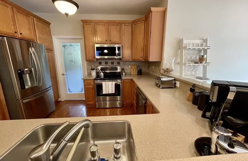 Enjoy your morning coffee in this peaceful, relaxing setting... Take a stroll over the private backyard bridge leading to a nature filled walk to the lake and fish off your private dock. Kayaks, paddle boards and a canoe are available for your use.