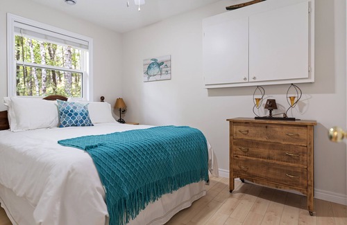 The Cottage is open concept with a beautiful vaulted ceiling and skylights. There are three bedroom - two with queen beds and one with bunk beds!