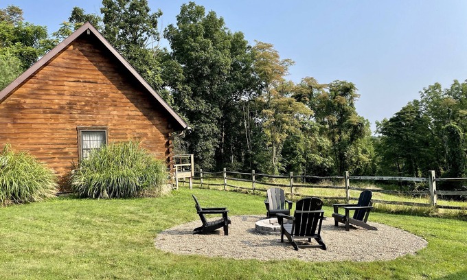 If you're looking for a secluded, yet convenient, quiet retreat, this log cabin tucked away in the rolling hills of Athens County is the place for you! Pick the front porch or the back deck for your morning coffee or evening nightcap with peaceful meadow views. Inside you'll find a cozy living room, featuring a gas fireplace, that's open to the kitchen and dining area. With cathedral ceilings that really show off the beauty of this log home. The kitchen has all the necessities including a stove, oven, microwave, toaster, refrigerator and more. For sleeping, you'll find a king sized bed in the first floor bedroom and a queen sized bed upstairs in the loft. Enjoy dinner on the back deck with a dining table set and grill, or toast s'mores around the fire pit. The cabin isn't huge but the views are grand! Just a short drive to Uptown Athens and Ohio University, and super convenient to a few of our area wineries like Shade Winery and our neighbors just a couple miles down the road - Pleasant Hill Winery!