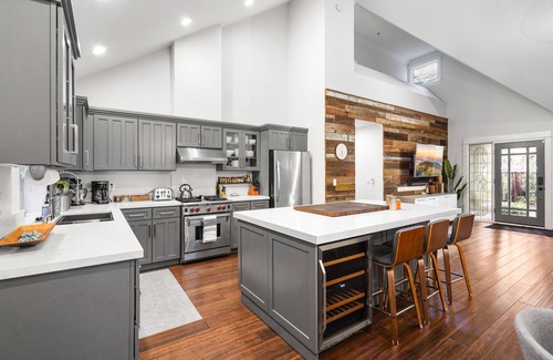 This beautifully-updated, Ranch-style home is the luxury version of your family's cabin in the woods. Tucked away in this peaceful location, you'll be treated to fine wood touches throughout the house, private outdoor space, and above-and-beyond hospitality. The spacious open living area boasts a vaulted ceiling, lavish full kitchen, and a custom, wood-burning fireplace that can be enjoyed inside or from the kitchen patio. Your gracious hosts provide an abundance of extras such as wood for the fireplace and fire pit, pantry staples as well as cooking oil and spices, and a seasonal Cornhole set. With an on-site washer and dryer, you'll barely need to pack anything!
