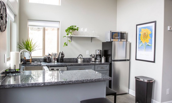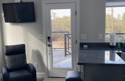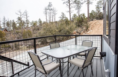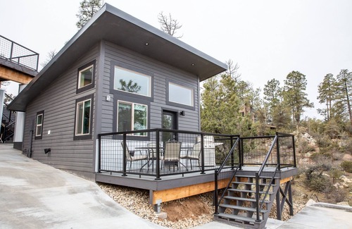 Brand new, stylish casita nestled in the pine forest! Peaceful, quiet and cozy--the perfect retreat for couples or small families. Quality furnishings and amenities designed to make your stay as comfortable as possible. Bright, sunny design with a private deck and seasonal creek to enjoy. Borders the national forest, yet only 7 minutes to downtown Prescott!