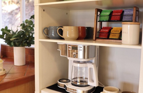 Inside, you’ll find a fully equipped kitchen and a thoughtfully stocked coffee + tea hutch, two smart TVs for streaming your favorite shows, central AC and heat, and blackout shades paired with luxury bamboo sheets for restful, uninterrupted sleep.