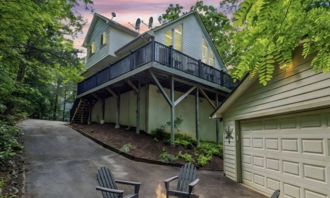 This retreat is equipped with everything you need for both relaxation and entertainment. Featuring three cozy bedrooms and two baths, it comfortably accommodates up to eight guests. The open floor plan enhances the flow of the space, highlighted by vaulted ceilings and a large wrap-around deck perfect for mingling during pre-wedding festivities. Enjoy game nights in the “Dan” cave, complete with ping pong, foosball, and more. For the wedding party, the nearby Rumbling Bald resort boasts exceptional amenities such as two restaurants, a Starbucks coffee shop, golf courses, and a wellness center with a spa—making it easy to pamper yourself before the big day!