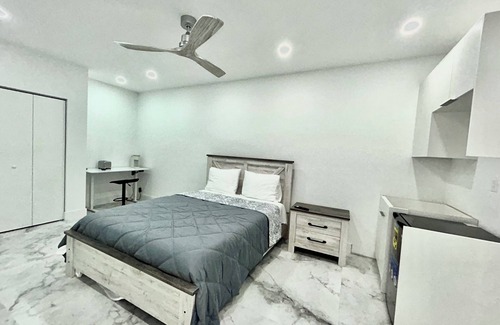 The spacious room boasts beautiful tile floors and is equipped with a 43-inch TV, a ceiling fan, blackout curtains, a queen-sized bed, a side table, and a desk with a bar stool. The kitchenette includes a microwave, coffee maker, mini refrigerator, toaster, and basic utensils for your convenience. The studio is modern, clean, and ideally situated.