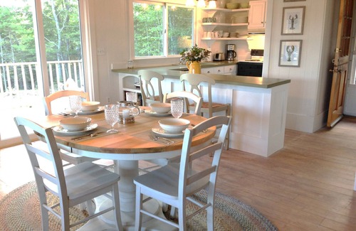 river and ocean, B's at Sea is a soothing retreat away from the bustle of Boothbay Harbor, yet close enough to enjoy all of its amenities. Newly updated and comfortably appointed for up to 8 guests, with 2 full bathrooms, new washer & dryer, gas grill, full kitchen with dishwasher, lobster feasting equipment, deck, all new bedding, pillows, linens, towels and beach towels, new furnishings, high speed wi-fi, cable tv, shared association sandy (at low tide) swim and picnic area 3 doors away, suitable for launching your canoe or kayak.