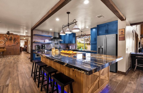 Fully Equipped for Entertaining: The spacious kitchen, featuring a 9-foot island, natural gas range, French door refrigerator, additional fridge, freezer, and separate ice-maker, is a chef’s dream. The large island with it's pop up power towers (that can charge your phone) make it great for a potluck or serve yourself buffet. The Kitchenaid mixer on its own lift (located in the island) provides a fuss-free baking prep area. Crock pots, Vitamix blender, ice cream maker, air fryer, and more provide unlimited options for every level of chef. Whether you prefer beans, grounds or pods, we have you covered with a grinder, coffee maker or Keurig. The large dining table seats 10+, with additional seating at the island (4) and the bar (4). The walk-in pantry allows you to stock up while the large laundry area with it's dog bathing station provides an efficient, functional cleaning space for your fur baby or larger items, like an ice chest (which is also included). The great room, with its cozy sectional and recliners, is perfect for family movie nights or playing a game at the bar, and the kettle style popcorn popper or snow cone maker provide the perfect snack (supplies included). The upstairs library is filled with a large variety of reading material, for the young and not-so-young.