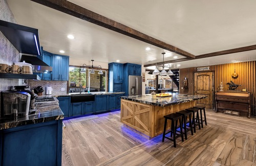 Fully Equipped for Entertaining: The spacious kitchen, featuring a 9-foot island, natural gas range, French door refrigerator, additional fridge, freezer, and separate ice-maker, is a chef’s dream. The large island with it's pop up power towers (that can charge your phone) make it great for a potluck or serve yourself buffet. The Kitchenaid mixer on its own lift (located in the island) provides a fuss-free baking prep area. Crock pots, Vitamix blender, ice cream maker, air fryer, and more provide unlimited options for every level of chef. Whether you prefer beans, grounds or pods, we have you covered with a grinder, coffee maker or Keurig. The large dining table seats 10+, with additional seating at the island (4) and the bar (4). The walk-in pantry allows you to stock up while the large laundry area with it's dog bathing station provides an efficient, functional cleaning space for your fur baby or larger items, like an ice chest (which is also included). The great room, with its cozy sectional and recliners, is perfect for family movie nights or playing a game at the bar, and the kettle style popcorn popper or snow cone maker provide the perfect snack (supplies included). The upstairs library is filled with a large variety of reading material, for the young and not-so-young.