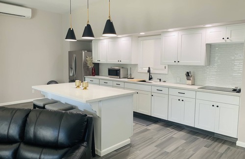 The Studio includes A/C, 75 inch flat screen TV, Internet , cable, brand new leather couch a very comfortable queen bed and washer & dryer.
