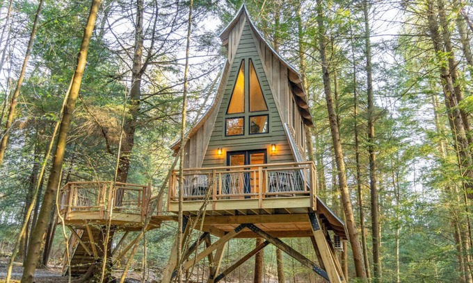 Welcome to the epitome of rustic elegance: our luxury treehouse retreat, delicately perched among the whispering hemlocks, where a crystal-clear creek meanders beneath your feet. Tucked away in a serene woodland setting, this remarkable treehouse is designed to envelop you in the tranquil beauty of nature, creating an experience that is nothing short of magical.
