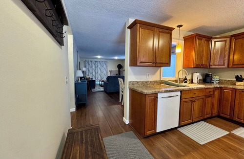Fully equipped kitchen with essentials such as pots & pans, dishes, glassware, eating and cooking utensils, blender, Keurig, crock pot and more
