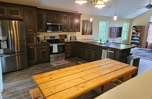 Home includes kitchen with full size refrigerator/freezer, oven/stove, microwave and dishwasher. Also stocked with pots and pans for cooking with plates, glasses and silverware to enjoy your masterpieces. Open concept living room is a space of relaxation on the sectional, with plenty of board games provided. TV has WIFI access if a lazy day on the couch is more your speed. Watch the sun rise through picturesque windows throughout the house or on the back deck with a cup of coffee.