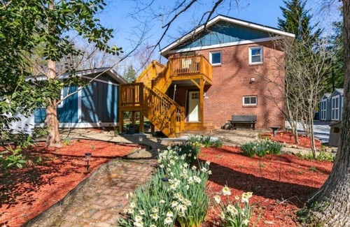 Nestled on a private lane minutes from the Asheville airport and situated between Asheville and Hendersonville, this 695 sq. ft upstairs duplex unit blends modern minimalism and comfort. The two-bedroom, one-bathroom unit features a full kitchen, living room, and dining room. Exterior stairs lead up to a private, open-air front porch with seating. Wall-mounted TVs are in each bedroom and the living room. Netflix access provided. Guests enjoy shared; hot tub, laundry room, and fire ring.