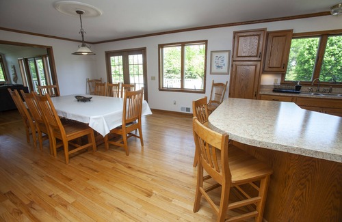 The Pleasant Lake Residence hosts a spacious and airy floor plan. A wood burning, stone fireplace graces the 18 x 24 foot family room. A large dining/kitchen area features a generous kitchen island, oak hardwood floors and overlooks Pleasant Lake. Tiled flooring covers the back entry, main floor bath and laundry room. One bedroom with two twin beds and a study complete the main floor plan. An open staircase leads upstairs to three bedrooms and two more full baths. The master bedroom is a generous sized room with a king size bed. The ensuite features a Jacuzzi tub. The finished lower floor offers ping pong, foosball, a card table, a gas fireplace as well as an 18 x 24 bedroom and a full bath. The lower floor has a sliding glass door that exits to the lakeside.
