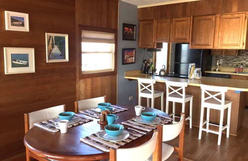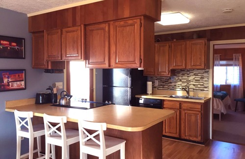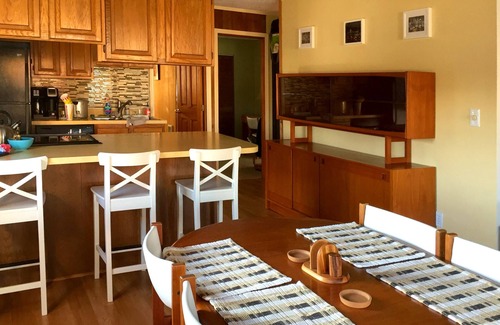 The full kitchen includes all new appliances and everything you need for a longer stay. There is casual seating around the breakfast bar or dining at the table for up to 6. There is a full-size washer and dryer in the bathroom.