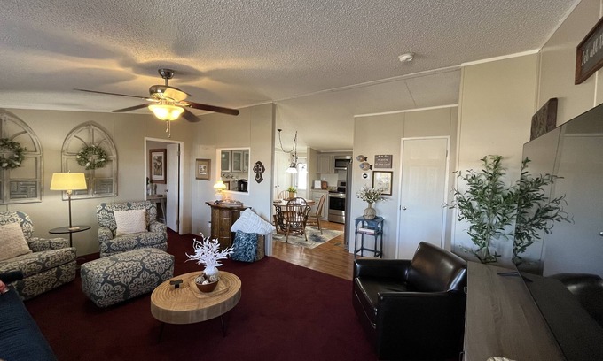 This property features 3 bedrooms with queen beds and 2 bathrooms. The view of the spring fed lake is stunning from the covered back porch and fenced in back yard. It’s only surpassed by the amazing sky full of stars, winking at you all night long.