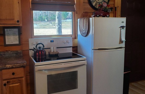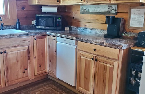The front door opens to a warm and welcoming room with cathedral ceilings. The Living room includes a 43" flat screen TV with Roku, a comfy queen-sized sleep sofa, with matching armchair. A dining table and four chairs. The kitchen is fully equipped to prepare and cook your favorite meals. Keurig coffee maker with a handful of k-cups. Paper towels provided. Dish soap and hand soap provided. To the right of the living room is the master bedroom with a queen-sized log bed, roku tv, wardrobe and chair. There is a loft access via the ladder with handrails which features twin sized log beds (Loft area and steep ladder may not be suitable for very young children). There is a full bathroom with a vanity and shower, equipped with hand soap and toilet paper. You will need to bring your own bath soap and toiletries. All towels, sheets, pillows and blankets provided. Iron and ironing board, luggage racks, a drying rack provided.