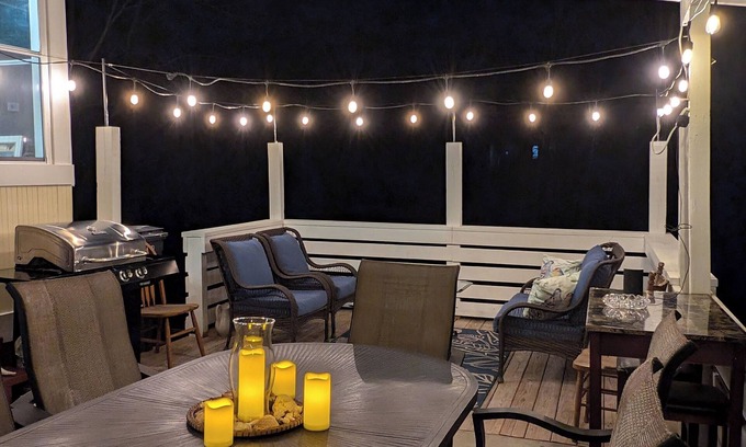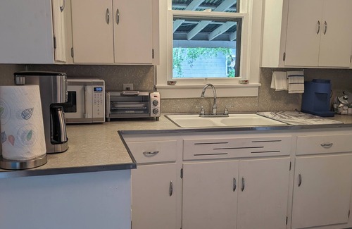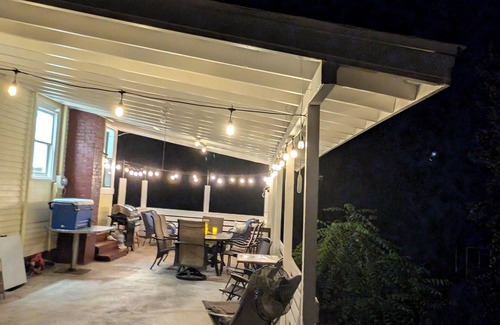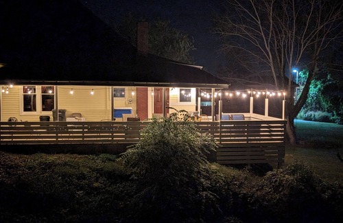 Your cozy getaway awaits on a quiet dead-end street in one of the safest counties in Kentucky. This phenomenal, restored 1930s house sits in historic Earlington, just outside Madisonville near I-69 and I-24. It has a large Southern style front porch, a swing, 3 bedrooms including 1 king, 1 queen, and 1 day bed in a quiet office or bedroom. This lovely property offers a pleasant bathroom with rose marble floor, a jetted bathtub and a comfy place to put on makeup. Enjoy the convenience of amenities like a washer/dryer, giant 75 inch smart tv, and high speed WiFi during your stay. We supply Lux 12 place-setting china and crystal stemware; every day Corelle, or paper plates according to your fancy. The home has a well-equipped kitchen and a breakfast nook with a pretty, secluded view. It has a fantastic outdoor entertainment space with a deck, a large gas grill, and a carport. Just bring your toothbrush. We are available to answer any questions while you stay at our place.