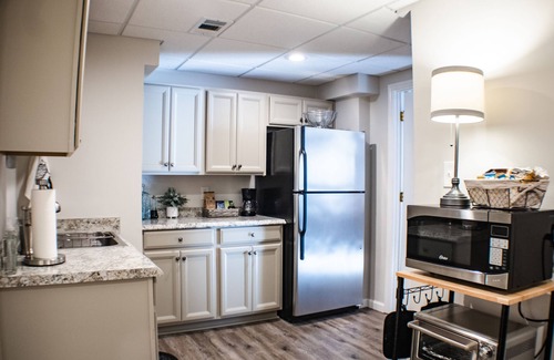 Kozy in Kennesaw features a private daylight basement apartment with a private, contactless entrance. It is centrally located, less than 10 minutes from KSU and Downtown Woodstock; 15 minutes from downtown Kennesaw; 20 minutes from Atlanta Braves' Truist Park & only 30 minutes from downtown Atlanta. Large bedroom with sitting area & workspace, spacious full bath, kitchenette with full-sized refrigerator and dining area, and spacious living room with TV/Roku and Foosball table.