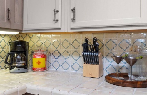 Step into a welcoming sunken living room with an inviting fireplace, which creates an authentic Santa Fe experience. Curl up with a good book, sip your beverage of choice by the crackling fireplace, or enjoy a peaceful moment with your feet up after a day of exploring the high desert on the nearby trails.