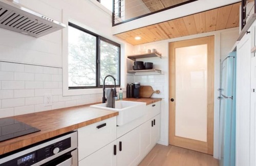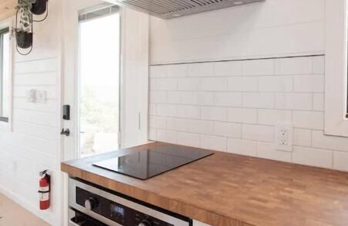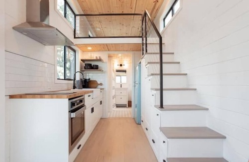This new Tiny home has two loft bedrooms with queen beds. It has all the amenities of home with a kitchen, bathroom with a shower and even a washer and dryer.