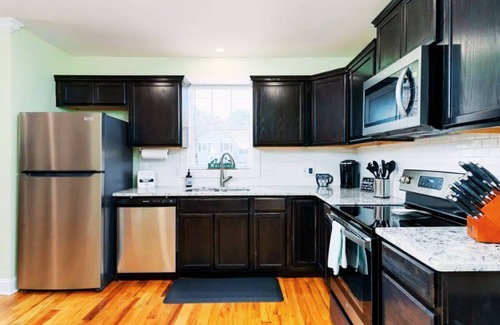 KITCHEN: Granite countertops and new stainless-steel appliances will make cooking a enjoyable part of your stay. The kitchen is fully stocked with most everything you could need and has extremely sharp knives! A dishwasher and microwave are also provided. A washer and dryer are located inside the home. A roll around island bar is provided. A wireless phone charger is conveniently located on the kitchen backsplash. The countertop height dining table seats 6 and is off the kitchen in large open floor space.