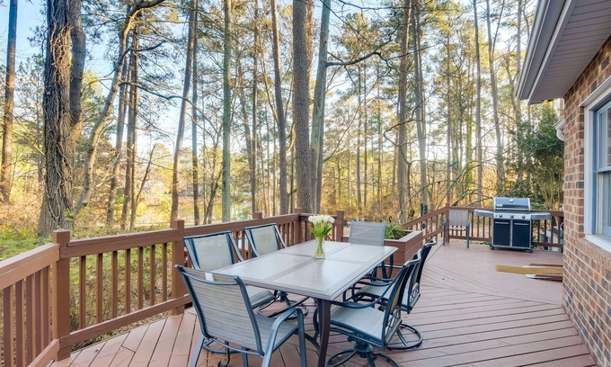 Experience a hassle-free Durham retreat at this well-stocked home south of the city. The vacation rental is highlighted by a spacious layout complete with 4 bedrooms, 2 full baths, 2 half baths, 2 living rooms, a multi-level deck, an open 1.5-acre yard for the kids to play, and a pond for feeding ducks, fishing, and birdwatching. The home is private yet close to shops, restaurants, I-40, Duke, NCCU, UNC, Raleigh, and more! This abode is sure to be the best spot for your next family getaway!