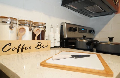 *The kitchen is fully stocked with a 4-burner stove, microwave, oven, fridge & freezer, mixing bowls, cooking spray, salt & pepper, knife set, cutting boards, can openers, baking trays, and a full coffee corner - including sugar, cream and coffee.