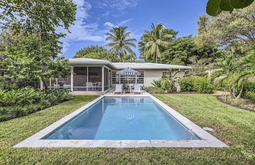 Completely updated with new furnishings (Sep 2023), this elegant 3 bedroom, 2 bathroom vacation home with a pool situated in an expansive tropical garden is located in charming Parrot Cove in the heart of historic Lake Worth Beach. This beautiful mid-century style home exudes an "Old Florida" ambience, but with modern appliances and amenities. When entering the home, the striking high vaulted ceiilings and large windows on 2 sides make it bright and airy. One of he main highlights of this property is a spacious outdoor screened-in living space surrounded by lush tropical gardens, which includes a dining area for up to 8 people.