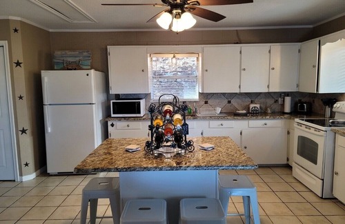 Welcome to our beautiful and spacious 1800 sq ft home with 3 bedrooms and 2 full bathrooms. Bedrooms have a king and 2 queen beds, along with king size trundle bed in the living room. Come enjoy our 2nd story covered patio with an amazing view of Medina Lake! Our upper and lower covered patios have tables, chairs, and a gas grill. We also provide a fire pit to enjoy with your family or friends. Our home is a 5 minute walk to the water. Plenty of parking available for your boat and a few cars!