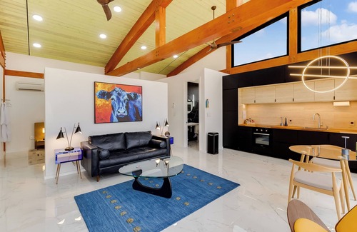 Unique luxury one-bedroom guesthouses on the Pedernales River in Johnson City. Spectacular views. Perfect for a memorable getaway to the Texas Hill Country and wine trail. Each house is ~650 sq. ft with king bed, modern bathroom, a living room/fully equipped kitchen, and an outdoor patio. One queen or two twin airbeds can be provided to sleep up to two more, or two couples could rent both houses. The other house is in a separate listing: Pedernales River Guesthouses - PONDER. Stairs take you down to the river. No pets. Free Level 2 EV charger for J1227 and Tesla.