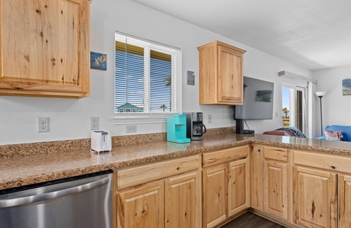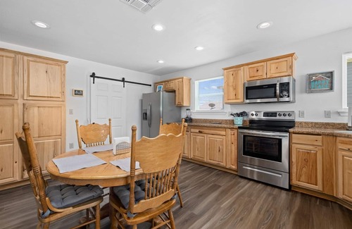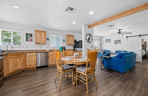 Decorated with spectacular photos from the local area, the open concept living room, dining room, and kitchen have direct water views. The living room offers seating for six with several comfortable armchairs and a sofa sleeper which folds out to a queen size bed. The flat-screen TV competes with the water view through the sliding glass door. The spacious kitchen offers a generous amount of counter space and a complete array of dishes, pots, pans, and appliances, including a dishwasher. The informal dining area seats four and with the quick addition of the table leaf can accommodate six.