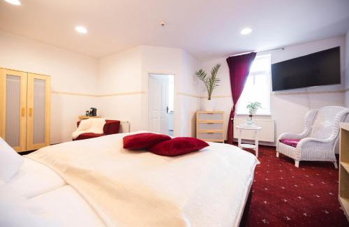 Providing city views, Pension Friedrichshof in Bad Klosterlausnitz features accommodations, a terrace, and a bar. This guest house provides free private parking, luggage storage space, and free Wifi. The accommodation offers room service and a tour desk for guests. At the guest house, all units come with a desk, a flat-screen TV, a private bathroom, bed linen, and towels. Additional in-room amenities include chocolates or cookies. At the guest house, all units are allergy-free and soundproof. Buffet and continental breakfast options with local specialities, fresh pastries, and fruit are available. Guests can eat at the on-site traditional restaurant, which is open for dinner, lunch, and cocktails. Guests at the guest house will be able to enjoy activities in and around Bad Klosterlausnitz, like cycling and hiking. Zoo Gera is 13 miles from Pension Friedrichshof, while Gera Central Station is 14 miles away. Leipzig/Halle Airport is 40 miles from the property.