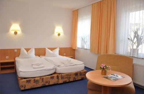 Housed in a historic half-timbered building, Pension Lindenhof offers rental bikes, a garden and free WiFi. It is located in Kromsdorf, 2953 feet from Kromsdorf Castle and 2.5 mi from Weimar. A TV, private bathroom and a desk are provided in each of the rooms at Pension Lindenhof. There is also an apartment, which features a fully equipped kitchen and a separate bedroom. Half board is available on request, and a buffet breakfast is available. Several restaurants are within 2625 feet of the property. You can explore the scenic Ilmtal cycle path, which runs past the guest house. Tierfurt Castle is 1.2 mi away and it is 2.9 mi to Weimar Train Station.