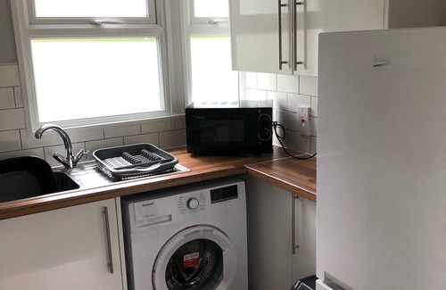 New fully fitted kitchen area including microwave and freestanding cooker, fridge freezer and washing machine.