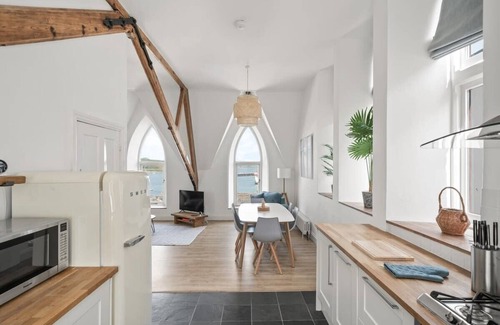 When you’re not out and about exploring all of Falmouth’s wonderful offerings, sit back and relax in your beautiful apartment. There isn’t another one like it - with rafted ceilings, exposed wooden beams and original stone walls. Spanning over two floors, enjoy slow mornings from the comfort of your sofa and admire the view of bobbing boats through lancet windows. Rustle up delicious breakfasts in the contemporary kitchen - where you’ll find brand new appliances alongside a characterful butler sink and retro Smeg fridge. Sociable nights can be enjoyed around the dining table, feasting on fresh produce picked up from local stores that day.