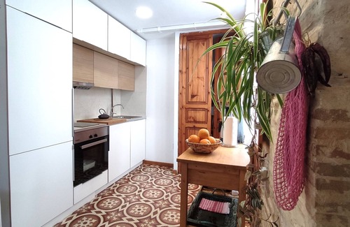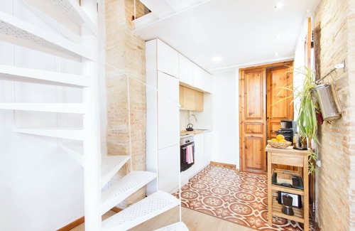 Renovated penthouse with a terrace, quiet, sunny, and cheerful. Located in a historic building dating from 1880, with four floors and no elevator. It offers views of the sunrise and sunset. The apartment is elevated above the rooftops and bell towers of Valencia's Old Town.