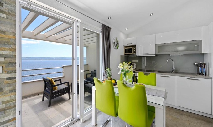 Penthouse Filka features air-conditioned accommodations in Mimice. This beachfront property offers access to a balcony, free private parking, and free Wifi. Each room is fitted with a patio with mountain views. The apartment provides guests with a terrace, sea views, a seating area, satellite flat-screen TV, a fully equipped kitchen with a dishwasher and an oven, and a private bathroom with walk-in shower and a hair dryer. A microwave, a toaster, and fridge are also available, as well as a coffee machine and a kettle. At the apartment complex, each unit is fitted with bed linen and towels. Juto Beach is a few steps from Penthouse Filka, while Salona Archeological Park is 25 miles from the property. Split Airport is 34 miles away.