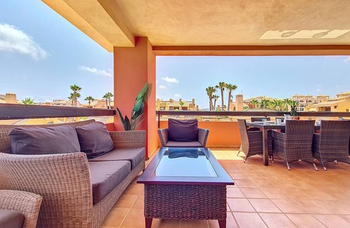 This bright and spacious corner penthouse apartment is a great choice for a relaxing holiday by the coast. With three comfortable bedrooms and plenty of wardrobe space, it’s ideal for families or groups. The main bedroom has its own ensuite bathroom, and there is a second family bathroom both are modern and feature walk-in showers.The large kitchen is fully equipped with everything you need during your stay, including a coffee machine, dishwasher, oven, hob, and plenty of storage space. There’s also a separate utility room with a washing machine, making longer stays even more convenient.The open plan living and dining area offers ample seating for six people, with two sofas and an armchair as well as a large dining table ideal for family meals or for a group of friends to socilaise, a smart TV, and lots of natural light thanks to the apartment’s corner position. Sliding doors lead out onto a generous L-shaped terrace, where you’ll find a dining table, a separate cosy seating area with a sofa, and an electric BBQ perfect for outdoor meals or quiet evenings. From the terrace, you can enjoy views over the communal pool and the well-kept gardens. Steps lead up from the terrace to a private rooftop solarium, with sun loungers and wide views across the sea and nearby mountains, an ideal spot to unwind and enjoy the sunshine.This well-located apartment offers plenty of space both inside and out, making it a great base for your holiday.Mar de Cristal, on the southern shore of the Mar Menor in Murcia, is a peaceful coastal resort ideal for families and water sports lovers. It boasts calm, warm, cristal-clear waters and a fine sandy beach recognized for its cleanliness and safety. The palm-lined promenade features lifeguards during summer, and accessible facilities, while the area offers a marina, sports clubs including tennis and padel, restaurants, and easy access to natural parks and nearby towns. With over 300 days of sunshine a year, it’s perfect for a relaxing yet active Mediterranean escape.Key Features:- Fully equipped kitchen with dishwasher- Krups coffee machine- Smart TV- Free fast Wi-Fi internet- Free parking space in garage- Use of the community swimming pool - Large corner terrace with Electric BBQ- Private rooftop solarium- Walking distance to the beach- Air conditioning/heating- 24-hour local supportBedroom Configuration:- Main Bedroom: Super king- Bedroom 2: Twin Beds x 2- Bedroom 3: Twin Beds x 2Swimming Pool:- Outdoor Pool- Children's PoolImportant Information:No LiftThe property is located 650 m from Restaurant Piccolo Mare, 650 m from Cafe Arena restaurant, 700 m from El Rincón del Puerto restaurant, 700 m from Mar de Cristal sand beach, 700 m from Mar de Cristal supermarket, 700 m from Isla Menores sandy beach, 3 km from Los Nietos train station, 6 km from La Manga Club golf course, 7 km from Calblanque nature reserve, 16 km from La Serena Golf golf course, 21 km from Renfe Cartagena train station, 30 km from Mar Menor golf course, 32 km from Roda golf course, 49 km from Murcia International airport, 105 km from Alicante airport.